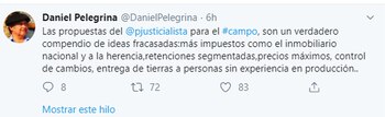 Además, el titular de la rural dijo, “esas propuestas distan mucho de las que conversamos con el candidato a presidente, Alberto Fernández, junto con la Mesa de Enlace, cuando le llevamos las Propuestas del Campo y la Producción, que contienen los 14 puntos que establecen los puntos centrales que nos preocupan, afectan e interesan a todos quienes producimos, vivimos y aportamos con nuestro trabajo en el campo, al desarrollo de los pueblos del interior”.