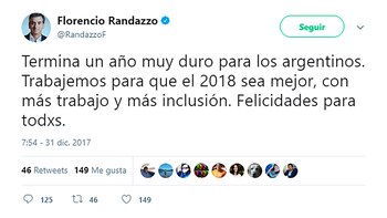 Instalado este inicio de 2018, como lo hace desde hace muchos años en Valeria del Mar, a dos cuadras de la playa, el ex ministro y ex candidato a senador por Cumplir, Florencio Randazzo, mandó un mensaje: "Termina un año muy duro para los argentinos. Trabajemos para que el 2018 sea mejor, con más trabajo y más inclusión. Felicidades para todxs".