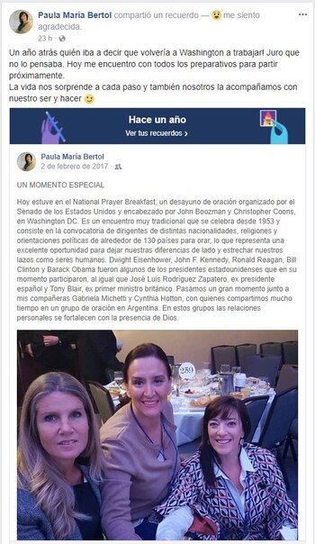 Según recordó en sus redes sociales, hace exactamente un año se encontraba en la capital estadounidense junto a sus antiguas compañeras del grupo de oración Gabriela Michetti y Cynthia Hotton, con quienes participó del National Prayer Breakfast, un desayuno de oración organizado por el Senado de los Estados Unidos. "¡Quién iba a decir que volvería a Washington a trabajar! Juro que no lo pensaba. Hoy me encuentro con todos los preparativos para partir próximamente. La vida nos sorprende a cada paso y también nosotros la acompañamos con nuestro ser y hacer!", reflexionó.