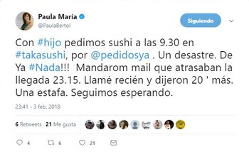 El sábado a la noche, la ex secretaria de Relaciones Parlamentarias de la Jefatura de Gabinete de Ministros Paula Bertol decidió darse un gusto junto a su hijo adolescente. Ordenaron sushi a través de una popular página de pedidos online, pero por algún motivo el pedido se demoró, y la comida tardó más de dos horas y media en llegar. Indignada, Bertol se quejó en sus redes sociales por lo que consideró "un desastre" y "una estafa".
