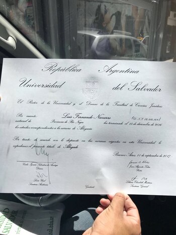 En rigor, Navarro se recibió hace ya un año, cuando rindió Filosofía del Derecho, su última materia. Tal vez para evitar las suspicacias que siempre rodean a los títulos obtenidos por los políticos antes de una campaña, el último exámen del "Chino" fue escrito, y sus disquisiciones sobre Aristóteles, Lutero y Calvino le valieron el 8 que lo transformó en "cuervo".