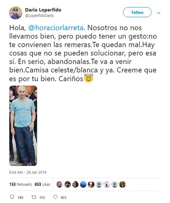 "Hola, @horaciorlarreta. Nosotros no nos llevamos bien, pero puedo tener un gesto: no te convienen las remeras. Te quedan mal. Hay cosas que no se pueden solucionar, pero es así. En serio, abandonalas. Te va a venir bien. Camisa celeste/blanca y ya. Creeme que es por tu bien. Cariños😇".