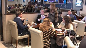 El precandidato presidencial Alberto Fernández se tomó un vuelo Buenos Aires-Córdoba en Aeroparque después del mediodía. Como antes había declarado en Comodoro Py en el marco de la causa del Memorándum con Irán, tuvo que almorzar en el Jorge Newbery.