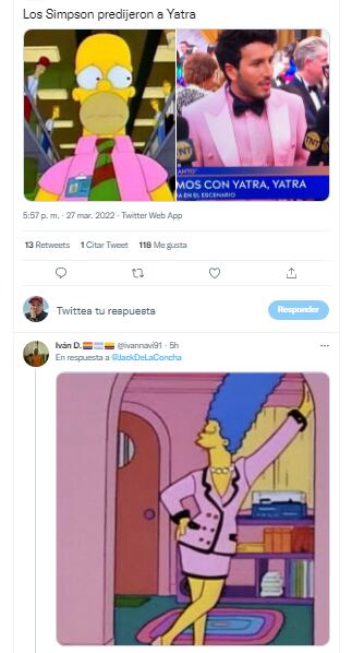 “很明显,亚特拉的儿子用塞巴斯蒂安的燕尾服洗了幸运的红帽子”,这是其他反应,正如预期的那样,辛普森一家再次预测了这位歌手的服装。荷马的粉红色衬衫和玛格的香奈儿西装被唤起,不同之处在于哥伦比亚人的服装显然是新的。