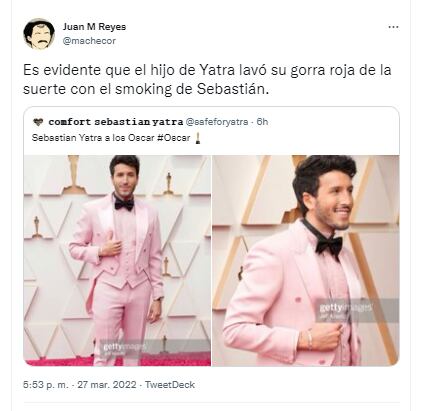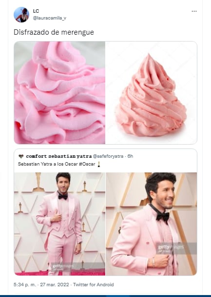 自从他到达洛杉矶杜比剧院(Dolby Theat re)以来,他的西装的粉红色非常醒目,以至于模因在社交网络(尤其是Twitter)中不久就出现了,有人提到他 “打扮成酥皮”,甚至嘲笑他洗衣服的方式。