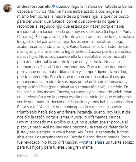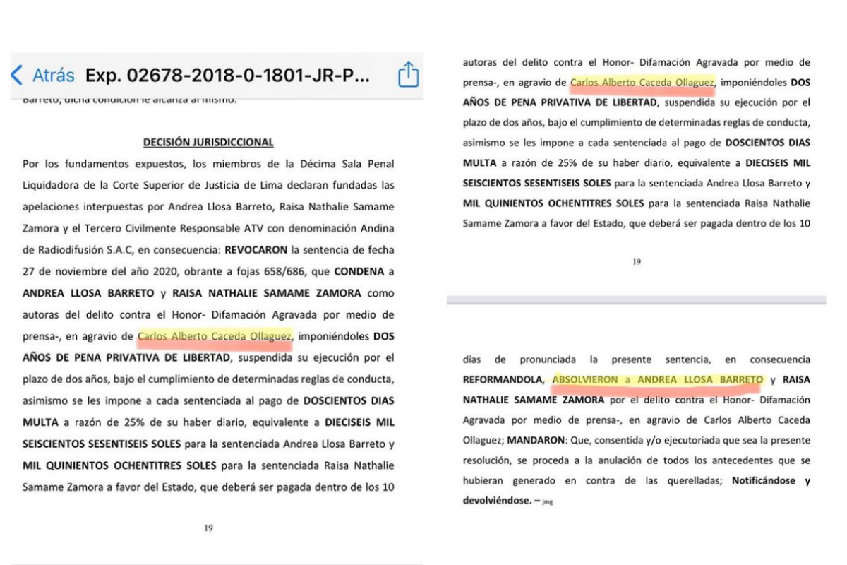 安德里亚·略@@ 萨(Andrea Llosa)在其官方 Instagram 帐户上发布的文件写道:“利马高等法院第十刑事清算分庭的成员宣布,安德里亚·略萨·巴雷托、雷莎·纳塔莉·萨莫拉和第三位民事责任亚视提出的上诉是有充分根据的。”。