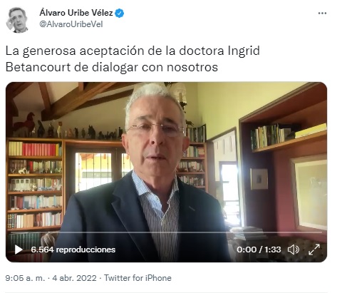 自3月31日以来,总统候选人英格丽·贝当古与前总统阿尔瓦罗·乌里韦·贝莱斯以及民主中心最高人物之间的对话得到了巩固。在社交网络上进行了多次互动之后,两位数字都证实了他们的做法,这使一些网民和公民感到惊讶,因为Verde Oxigeno的领导人拒绝了许多传统行业,这也是她离开埃斯佩兰萨中心联盟的原因之一,UribeVélez分享了4月4日,他在录像中确认贝当古将与他会面。