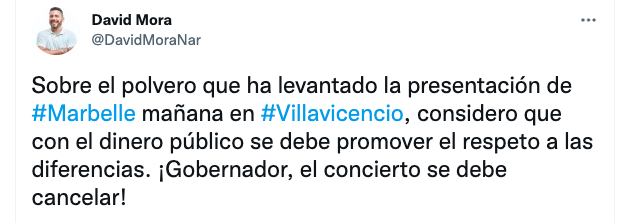 在活动开始前几天,一些公民要求梅塔政府取消Marbelle的演讲,但是,它继续进行。“关于明天在 #Villavicencio 中提出 #Marbelle 演讲的粉末,我认为应该通过公共资金促进对差异的尊重。州长,演唱会必须取消!”,一位网友评论道。