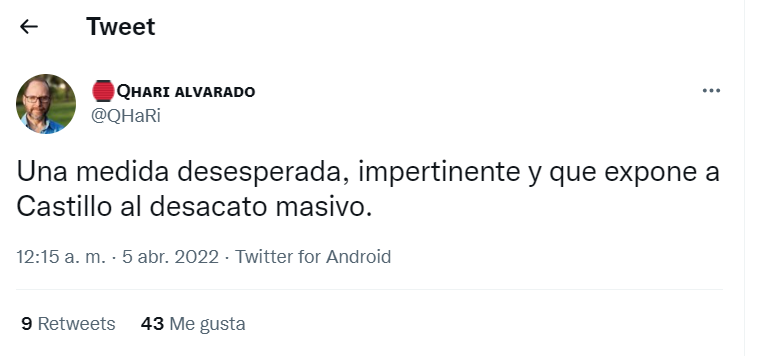 卡里·阿尔瓦拉多(Qhari Alvarado)是另一位反对佩德罗·卡斯蒂略宣布 4 月 5 日将是宵禁的决定的人。他补充说:“这是一项绝望、无礼的措施,使卡斯蒂略受到大规模蔑视。”