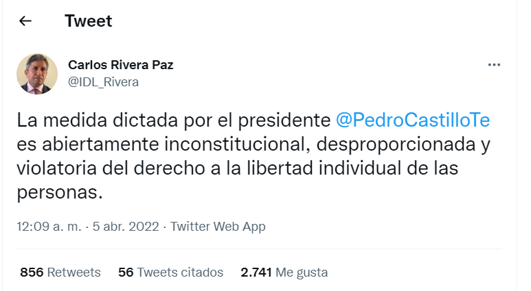 卡洛斯·里维拉承认,佩德罗·卡斯蒂略总统的措施公开符合宪法,不成比例,侵犯了个人的个人自由权。