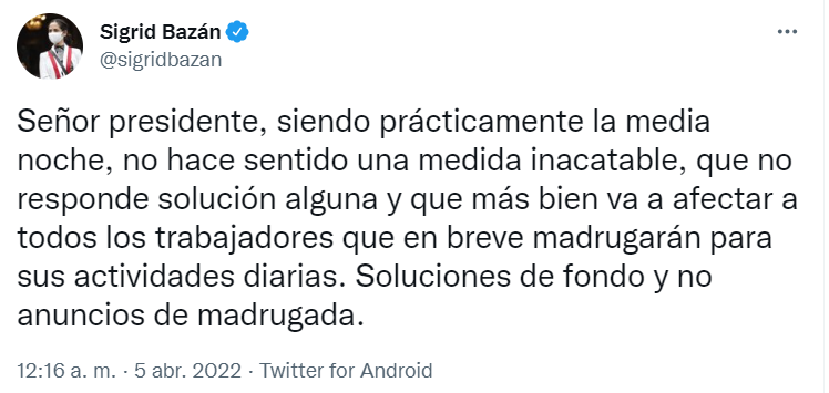 共和国国会议员西格丽德·巴赞(Sigrid Bazán)也抨击佩德罗·卡斯蒂略(Pedro Castillo)仓促决定平息交通停工的水域。“总统先生,现在实际上是午夜,一项不可接受的措施是没有道理的,它对任何解决方案都没有反应,反而会影响所有很快就会早起日常活动的工人。解决方案