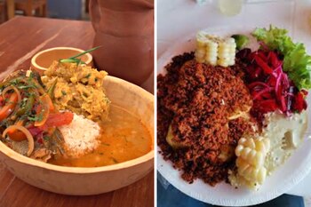 Malarrabia 结合了煮熟的香蕉的 masado,用大蒜、辣椒和洋葱以及碎山羊奶酪调味。所有这些都伴随着用盐水或汗水制成的鱼,以及通常在鹰嘴豆,豆类和小扁豆之间变化的炖菜。这道菜很好地综合了这个地方的复杂文化。