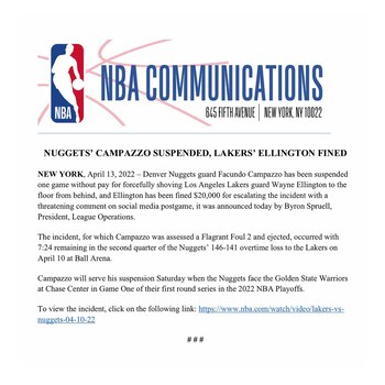 好吧,在一份声明中,NBA宣布了对阿根廷国家队控球后卫和皇家马德里多冠军的制裁。信中写道:“丹佛掘金队的后卫法昆多·坎帕佐因将韦恩·埃灵顿从后面推倒并将他送到地上而被停赛一场比赛。”对于湖人队球员来说,威胁不是免费的。“会议结束后,他在社交媒体上发表评论,使事件升级”,他被罚款2万美元。