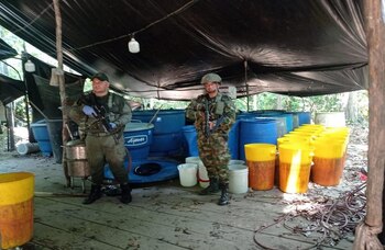 该行动是在视察圣何塞德奥库内时进行的。根据国民军的说法,当局在那里找到了 “七座木制建筑,里面装有用于加工生物碱的化学前体”。