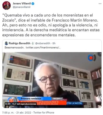 弗朗西斯科·马丁·@@ 莫雷诺说:“我在佐卡洛活活烧死了每个莫雷尼斯塔人”,弗朗西斯科·马丁·莫雷诺的不可言喻地说。啊,但这不是仇恨,也不是为暴力道歉,也不是不宽容。这位官员兼作家写道,媒体右翼喜欢这些心理 encomenderos 的表达。
