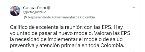 “Califico de excelente la reunión con las EPS. Hay voluntad de pasar al nuevo modelo. Valoran la necesidad de implementar el modelo de salud preventiva y atención primaria en toda Colombia”, trinó el presidente Petro tras el encuentro.