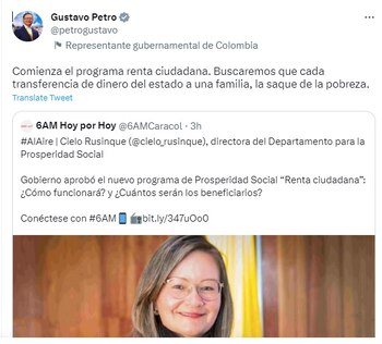 Luego de que Rusinque confirmara que desde el próximo mes de abril comenzará a entregarse el subsidio de Renta Ciudadana, el presidente de Colombia, Gustavo Petro, se pronunció a través de sus redes sociales asegurando que, por medio del programa, buscarán “sacar de la pobreza” a las familias más vulnerables del país.