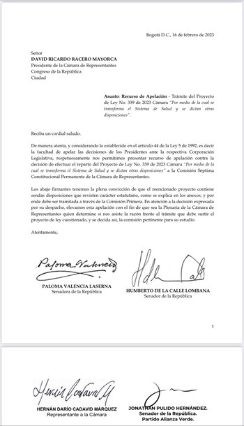 “Los abajo firmantes tenemos la plena convicción de que el mencionado proyecto contiene sendas disposiciones que revisten carácter estatutario”, se lee en la carta dirigida a Racero. Algunos de los congresistas que entregaron ese recurso son Paloma Valencia, Humberto de la Calle, Hernán Cadavid y Jota Pe Hernández.