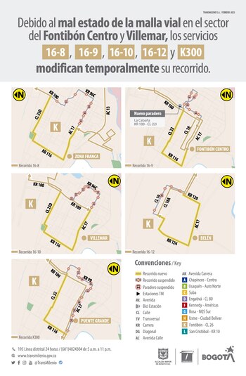 - Servicio 16-10: cambia su recorrido por la carrera 100, carrera 96 y un tramo de la calle 17. Transitará temporalmente por la carrera 116 desde la calle 17, llegando a la calle 23d hasta la carrera 100.