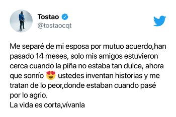 En una publicación en su cuenta de twitter, Tostao aseguró que la separación de Goyo se registró hace14 meses, y que no ha sido fácil, pues solo sus amigos más cercanos estuvieron en el momento del divorcio.