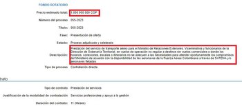 En el apartado del fondo rotatorio compartido por el cabildalte se explica que el contrato tiene por objetivo la prestación de servicio de transporte aéreo tanto del ministro de Relaciones Exteriores, sus viceministros y los funcionarios de la Dirección de Soberanía Territorial.
