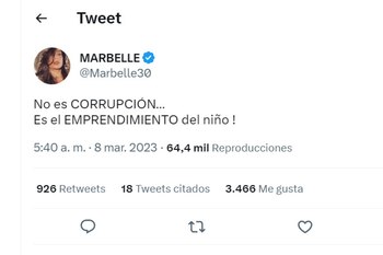 “No es corrupción”, escribió en un principio la cantante en la mañana de este 8 de marzo y agregó “es el emprendimiento del niño”. Haciendo referencia a Nicolás Petro, Marbelle señaló de manera sarcástica que sus presuntos arreglos con mafiosos para recibir dineros en la campaña de Gustavo Petro, simplemente eran negocios del heredero del Presidente.