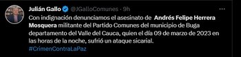 Por medio de un comunicado, el Partido Comunes rechazó el homicidio de Andrés Felipe Herrera Mosquera quien también fue parte de la primera línea y representante en las mesas de diálogo con la alcaldía de Buga durante el paro nacional de 2021. De momento, las autoridades no tienen claras las razones del asesinato, ni a los autores materiales e intelectuales del ataque.
