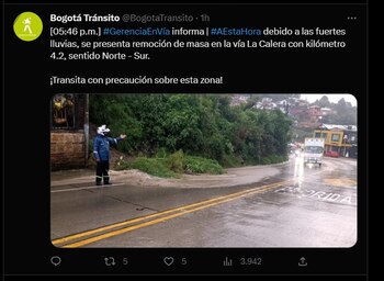 Minutos después, la misma cuenta reportó un desastre en La Calera. “Debido a las fuertes lluvias, se presenta remoción de masa en la vía La Calera con kilómetro 4.2, sentido Norte - Sur. ¡Transita con precaución sobre esta zona!”.