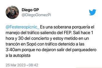 Briceño, desde el pasado 23 de marzo se está llevando a cabo el Festival Estéreo Picnic que va hasta el domingo 26 de marzo. Luego de los dos primeros días disfrutando de las presentaciones de artistas como Drake, Blondie, Rosalía, Twenty One Pilots, entre otros, los asistentes del FEP amanecieron en un trancón este sábado 25 de marzo cuando iban de regreso a sus casas.