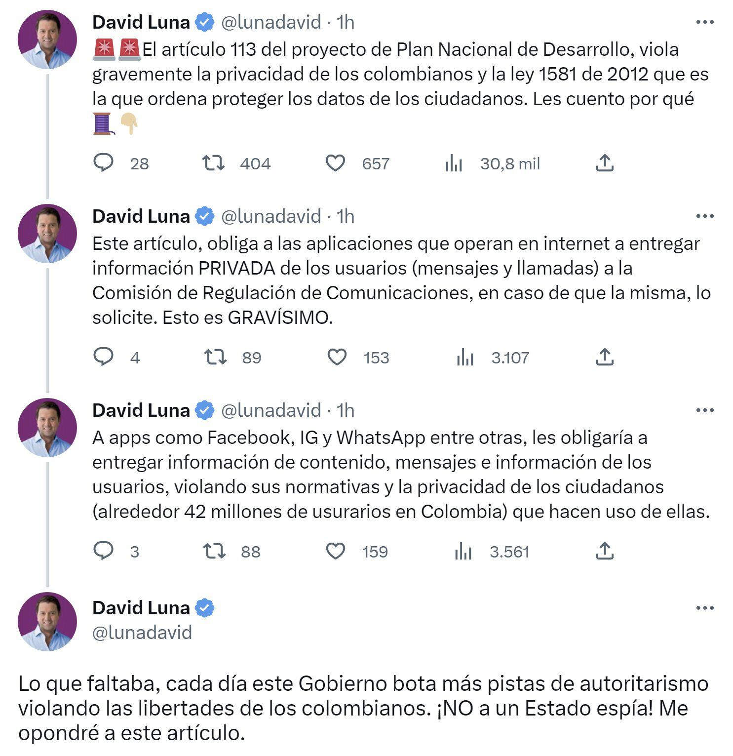 El senador de Cambio Radical, David Luna, quien fue ministro de Tecnologías de la Información y las Comunicaciones de 2015 a 2018 durante el gobierno de Juan Manuel Santos, señaló que hay un artículo que viola la privacidad de los usuarios de redes sociales en Colombia.