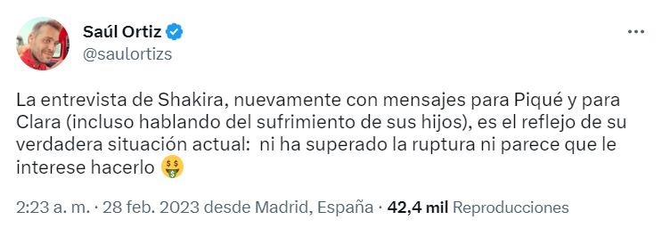 “Qué obsesión, madre mía. La entrevista de Shakira, nuevamente con mensajes contra Piqué y Clara, incluso hablando del sufrimiento de sus hijos”, “No quiere pasar la página, pues el despecho le está saliendo bastante lucrativo”, “Ese es el reflejo de su verdadera situación actual: ni ha superado la ruptura ni parece que le interese hacerlo”.
