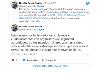 “Dos alertas de presencia guerrillera en el departamento no pueden tomarse con ligereza, así se trate de anuncios o estrategias de propaganda por redes sociales”, trinó García, quien además informó que le solicitó al Ejército, a la Policía Nacional, a la Fiscalía General, a la Secretaría de Gobierno de Cundinamarca y a los alcaldes de la región, a realizar un consejo de seguridad urgente.