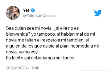 A través de su cuenta oficial de Twitter, el influenciador nacido en Medellín envió un mensaje a todos aquellos que han criticado a su nueva novia o que la han rechazado. “Sea quien sea mi novia, ¿si ella no es bienvenida? yo tampoco, si hablan mal de mi novia me faltan el respeto a mí también, si alguien de los que asiste al plan incomoda a mi novia, yo no voy. Es fácil y así deberíamos ser todos”, escribió Cossio.