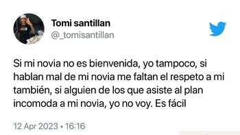 Las palabras de Cossio, aunque románticas para algunos, fueron reveladas por varios internautas señalando que Yeferson Cossio había plagiado el trino de otro usuario. En efecto, en el perfil de Tomi Santillan hay un trino de días antes al del famoso en el que se lee lo mismo que Cossio escribió, tan solo que le añadió algunas palabras. “Si mi novia no es bienvenida, yo tampoco, si hablan mal de mi novia me faltan el respeto a mi también, si alguien de los que asiste al plan incomoda a mi novia, yo no voy. Es fácil”, se lee en el trino del otro usuario.