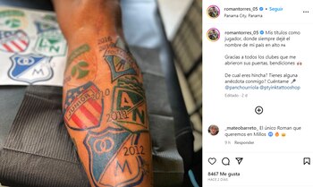 En una publicación en sus redes sociales, Román Torres compartió con sus seguidores su más reciente tatuaje y este sorprendió a muchos. La imagen muestra que en una de sus pantorrillas el panameño decidió plasmar los escudos de los equipos con los que salió campeón a lo largo de su carrera deportiva y aunque eso no tendría nada de raro a muchos les pareció muy curioso que al lado del de Millonarios estuviera el de Atlético Nacional, rival acérrimo en el campeonato colombiano.