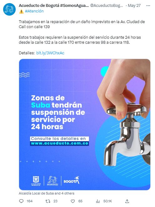 El sábado 27 de mayo (EAAB) la Empresa de Acueducto y Alcantarillado de Bogotá informó a la ciudadanía sobre la suspensión del servicio de agua en 16 barrios de la localidad de Suba, al nororiente de la ciudad, por un daño que se registró en una tubería ubicada en la avenida Ciudad de Cali con calle 139. “Estos trabajos de reparación requieren la suspensión del servicio de agua durante 24 horas, en el sector ubicado desde la calle 132 a la calle 170 entre carreras 98 a carrera 118 debido al cierre de la Línea Tibabuyes”, indicó la EAAB en un comunicado.