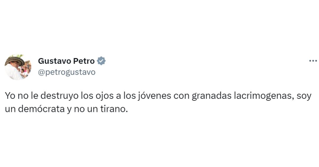 En su mensaje, el presidente Petro recordó los hechos que se registraron en medio del paro nacional que dejó a varias personas heridas, entre ellas, algunas que perdieron sus ojos por la fuerte respuesta de miembros de la fuerza pública, por lo que el primer mandatario aseguró que él no tiene ese tipo de comportamiento, pues es un demócrata.