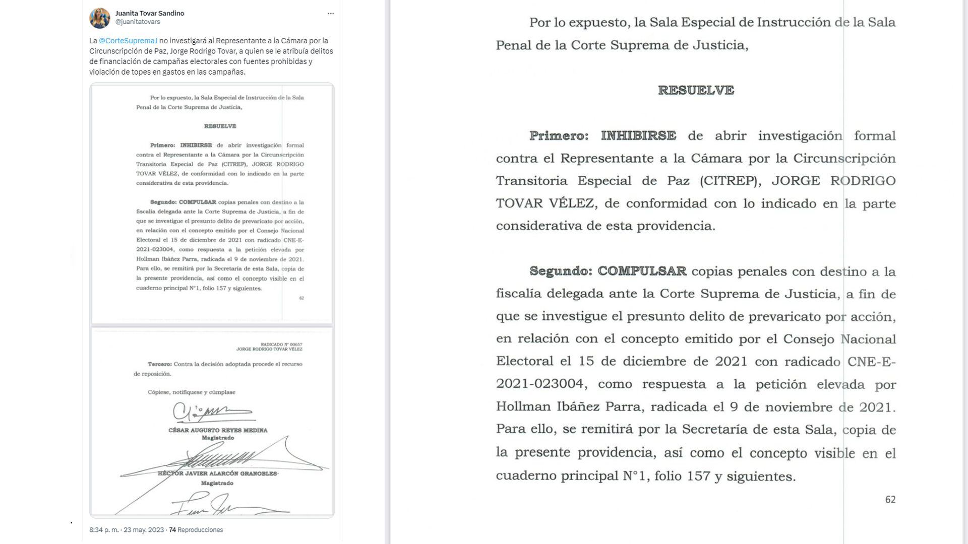 El abogado del representante Tovar Vélez, Hollman Ibáñez Parra, confirmó la información en Twitter, y celebró la providencia de la Corte Suprema de Justicia: