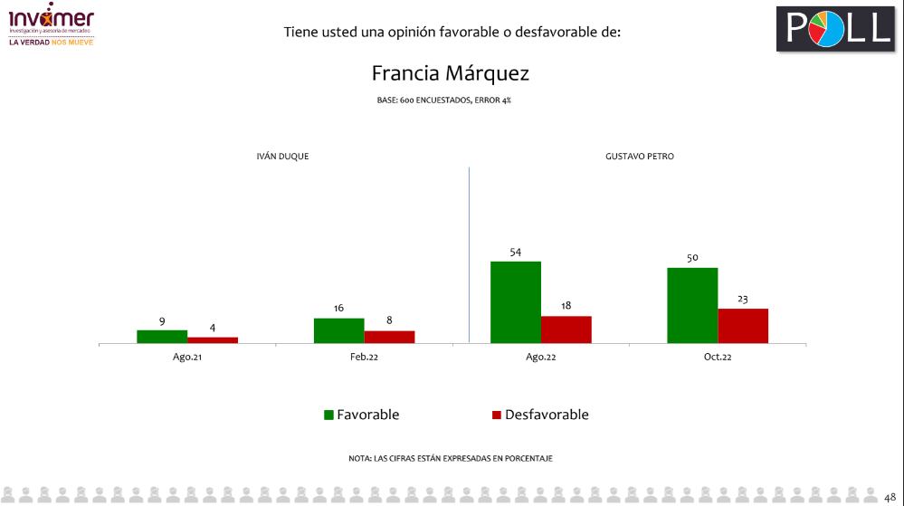 Esta encuesta muestra que solo el 27.9% de las personas encuestadas aprueba el desempeño de la vicepresidenta en los 10 meses de gobierno que lleva en el cargo; por otro lado, la desfavorabilidad de la funcionaria se incrementó a 59.9%. El golpe ,es más fuerte si se tiene en cuenta que en época electoral Francia Márquez había obtenido más de 700 mil votos en la consulta interpartidista, lo que le valió para ser elegida posteriormente como la fórmula vicepresidencial del entonces candidato, Gustavo Petro.