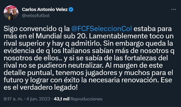 Con esas sensaciones se quedó Carlos Antonio Vélez. El periodista, quien ha criticado con dureza a Lorenzo por seguir convocando jugadores con poco ritmo de competencia como James Rodríguez o Falcao García, y hasta lesionados como ocurrió con Juan Fernando Quintero durante los amistosos que disputó la Selección en marzo ante Corea del Sur y Japón; hizo un balance de lo que dejó el equipo juvenil dirigido por Héctor Cárdenas. En su cuenta de Twitter, Vélez señaló: