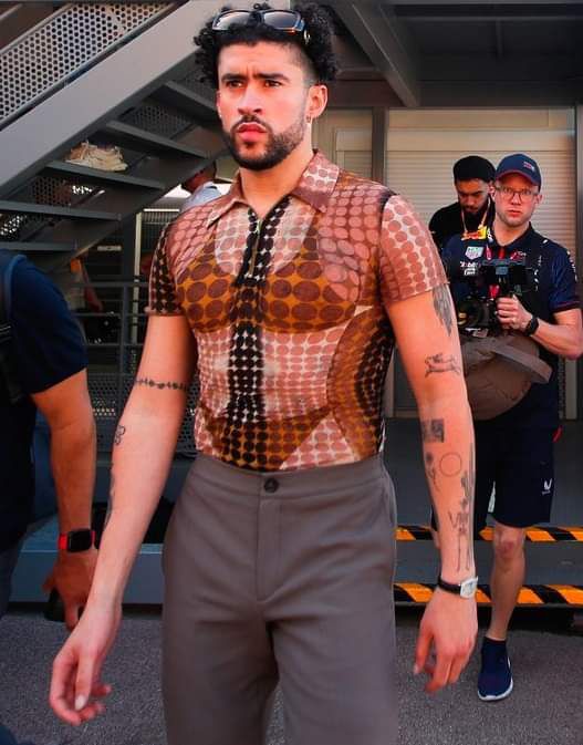 Para acompañar este arriesgado atuendo, Bad Bunny se decidió por un pantalón elegante y vintage de color gris, unas gafas de sol Gucci que hacían juego con el color de la camisa. También lució su cabello rizado. Todo esto mientras acompañaba al piloto Checo Perez, de 33 años de edad, a sus prácticas previas a la carrera del domingo.