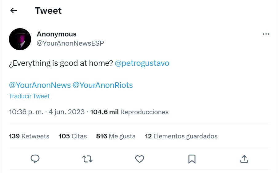 Minutos después de su primera aparición, Anonymous volvió a mencionar a Gustavo Petro, pero esta vez respondiendo a un trino subido por el primer mandatario donde se le ve sonriente junto a su hija, y con el mensaje “¿Intranquilos? ¡Qué va!” Los hackers no demoraron en enviarle lo que sería una amenaza: “No lo sé... no estaría tan tranquilo querido presidente” se traduce en el trino publicado en las últimas horas.