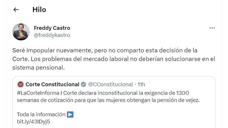 “Seré impopular nuevamente, pero no comparto esta decisión de la Corte. Los problemas del mercado laboral no deberían solucionarse en el sistema pensional. Como sociedad debemos definir medidas para ahorrar más para la vejez e incrementar la calidad del mercado laboral. La inequidad de género no se soluciona con reducciones en las semanas cotizadas”, trinó el exfuncionario.