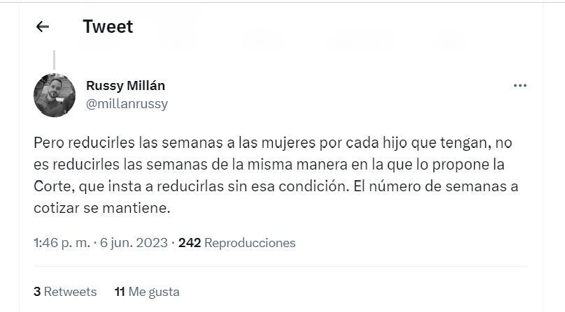 Ante los comentarios que surgieron en redes sociales de que el artículo 36 del proyecto de reforma pensional del gobierno Gustavo Petro, en el componente de prima media, las mujeres con hijos tendrán una reducción de 50 semanas por cada hijo (máximo tres hijos, el economista Russy Millán hizo una notable aclaración.