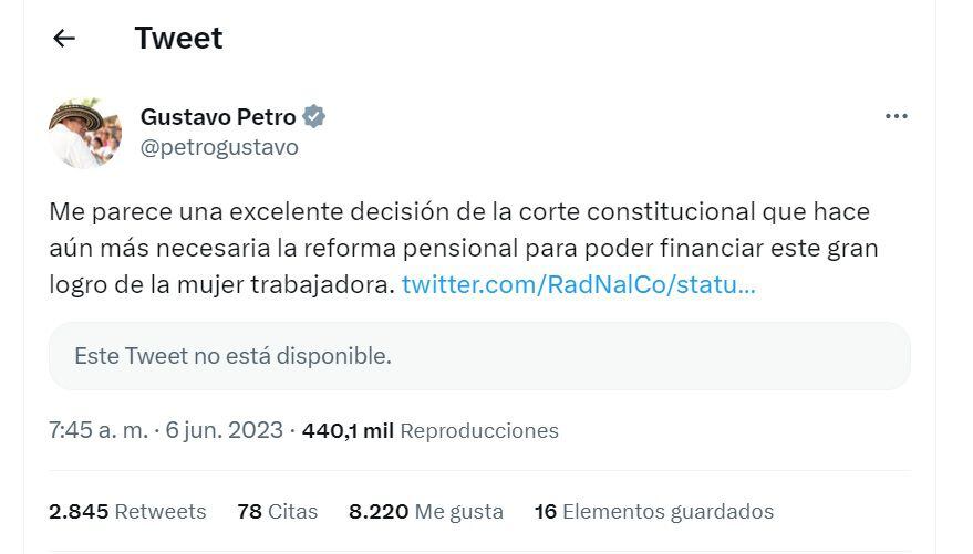 “Me parece una excelente decisión de la Corte Constitucional que hace aún más necesaria la reforma pensional para poder financiar este gran logro de la mujer trabajadora”, escribió el mandatario por medio de Twitter.