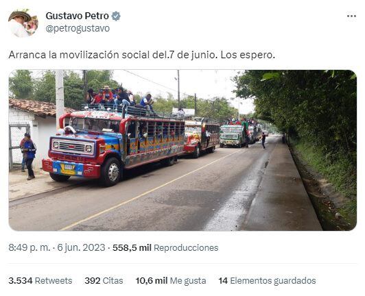 “Arranca la movilización social del.7 de junio. Los espero (sic)”, trinó el mandatario junto con una foto de los buses con los que indígenas en el Cauca viajaron hacia Cali.