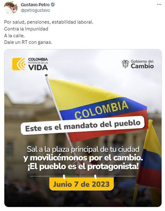 “Estaré este dia recorriendo las calles con la marcha. Invito a quienes votaron por el cambio y a quienes desean justicia en Colombia a marchar en todos los municipios. No solo por las reformas sino una gran marcha nacional contra la impunidad. !Que haya Justicia en Colombia! (sic)”, aseguró en su cuenta oficial de Twitter el pasado 31 de mayo.