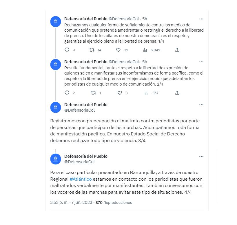 Sobre las agresiones sufridas por los tres periodistas en Barranquilla, desde la Defensoría informaron que a través de la Regional Atlántico se pusieron en contacto con los comunicadores. También sostuvieron un diálogo con los voceros de las marchas para que evitar que este tipo de situaciones se repitan.