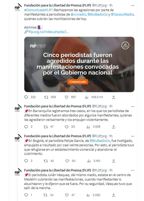 Sobre el discurso del presidente Petro, desde la FLIP repararon en que este “debe procurar favorecer un ambiente óptimo para que los y las periodistas desarrollen su trabajo en todo momento. Contrario a lo que hizo hoy, el mandatario debe enviar mensajes a sus seguidores sobre la importancia del respeto al trabajo periodístico y a la diversidad de opiniones”.