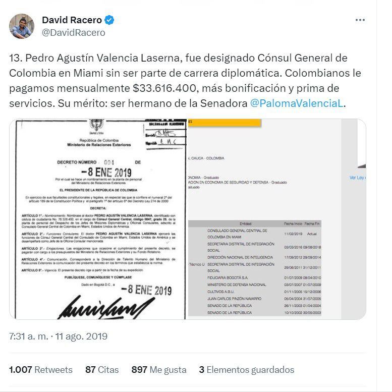 En esa misma línea varios internautas mencionaron: “Pedro Agustín Valencia Laserna, fue designado Cónsul General de Colombia en Miami sin ser parte de carrera diplomática. ¿No hay conflicto de interés?”; “Consul en Miami, Pedro Agustín Valencia Laserna también tiene un mérito: Ser hermano de la senadora Paloma Valencia. Hablar duro paga.”; “Sr Iván Duque, como puede ser que Pedro Agustín Valencia Laserna hermano de Paloma Valencia puede ser Cónsul en Miami, un Sr que no tiene experiencia en relacionas políticas un aparecido, sr Iván Duque usted en las elecciones manifestó nada de mermelada, la lengua castiga o no”.